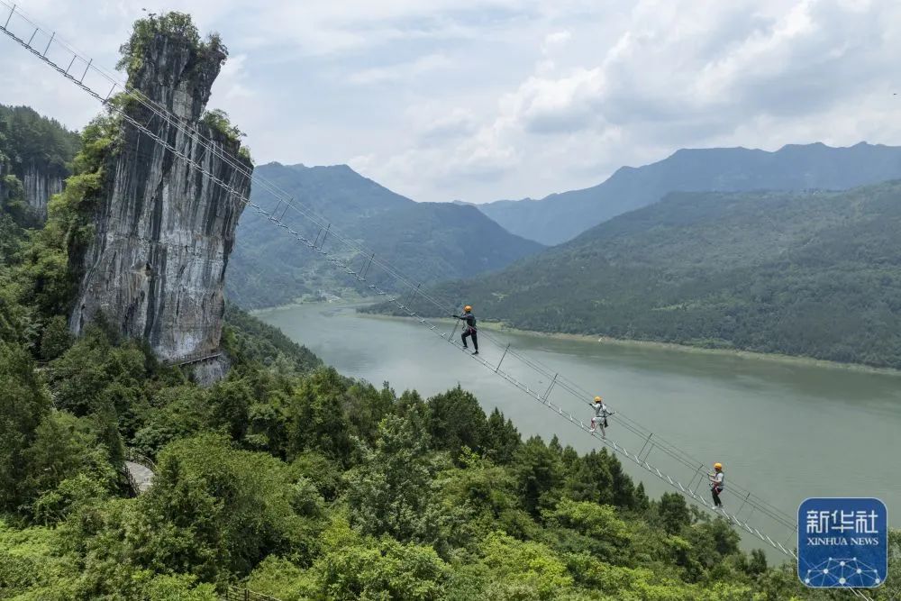 湖北省恩施市新塘乡红花峰林景区,游客在体验“彩桥”项目新华社发(宋文摄)