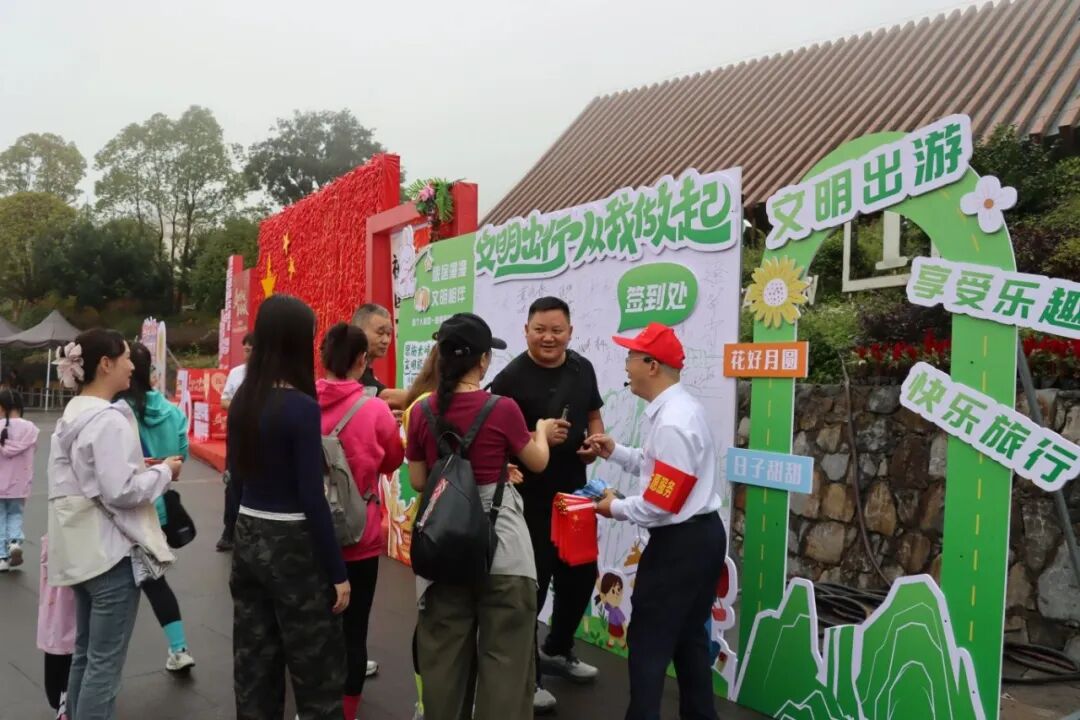 与此同时,各志愿服务点同步推进文明旅游宣传,通过发放宣传资料与趣味知识问答相结合的方式,将文明旅游规范转化为“答对有礼”的互动体验,催生了“文明打卡”的新风尚。当日共计发放文明旅游宣传手册530余份,吸引了320余名游客积极参与。