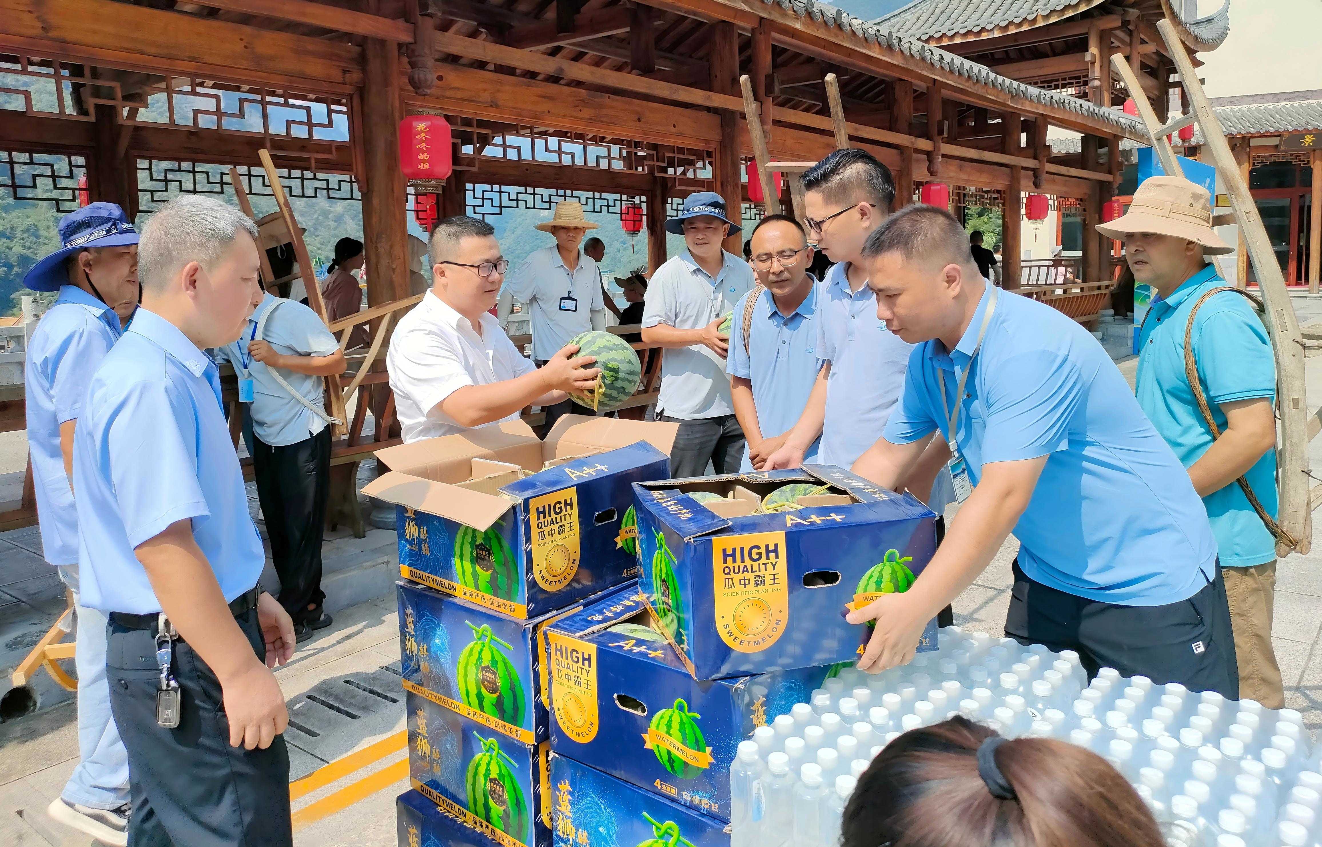 在清江画廊景区,宜昌集团党委委员、纪委书记、工会主席邓江权将一箱箱甘甜多汁的西瓜、一瓶瓶清冽爽口的矿泉水、藿香正气液、人丹、风油精送到职工手中,并关心他们高温下的工作状态。邓江权强调,员工的身心健康是集团最宝贵的财富,集团上下时刻牵挂着大家的健康与安全,高温下作业,一定要把安全放在首位,工会将持续当好“娘家人”,全力做好各项后勤保障工作。