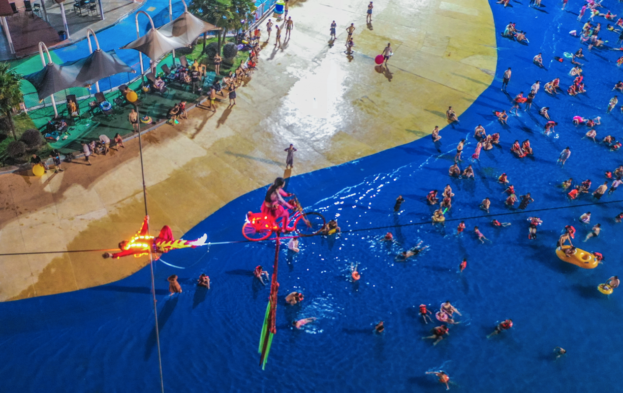 夜幕降临,水上乐园内人头攒动,钢丝飞车,环球飞车表演、疯狂海啸等活动震撼开演。伴随着激昂的音乐,一束束烟花直冲云霄,绽放出绚丽夺目的光彩。烟花的轰鸣声与游客们的欢笑声交织在一起,构成夏日夜晚里一曲美妙的乐章,让游客们在观赏飞车项目的惊险刺激后,感受烟花带来的浪漫。